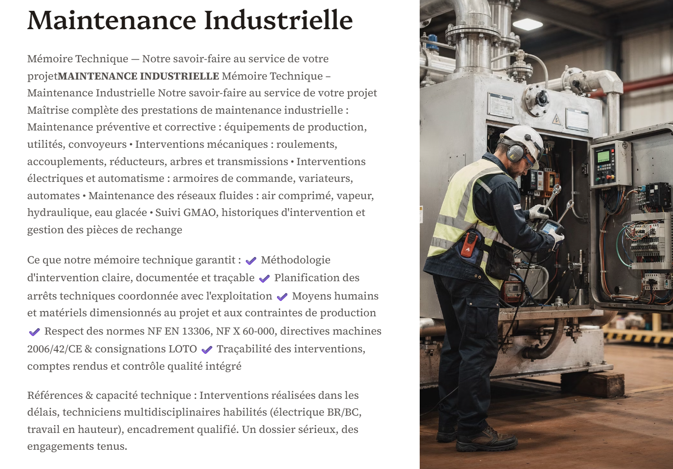 Pack complet pour répondre à un appel d'offres en lot Maintenance Industrielle. Comprend 4 documents : mémoire technique, PPSPS, SOGED et SOPAQ. Conformes aux normes NF EN 13306 maintenance et NF EN ISO 9001 qualité. Formats Word et Excel modifiables. Livraison immédiate après paiement.