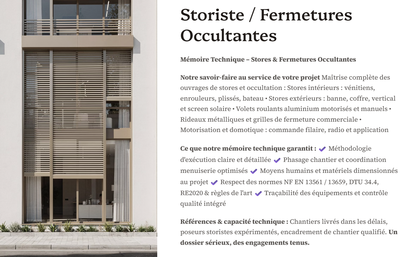 Pack complet pour répondre à un appel d'offres en lot Storiste. Comprend 4 documents : mémoire technique, PPSPS, SOGED et SOPAQ. Conformes aux normes NF EN 13561 stores extérieurs et NF EN 13659 volets. Formats Word et Excel modifiables. Livraison immédiate après paiement.