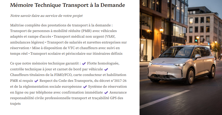 Pack complet pour répondre à un appel d'offres en lot Transport à la Demande. Comprend 4 documents : mémoire technique, PPSPS, SOGED et SOPAQ. Conformes aux exigences marchés publics transport et Code des transports. Formats Word et Excel modifiables. Livraison immédiate après paiement.